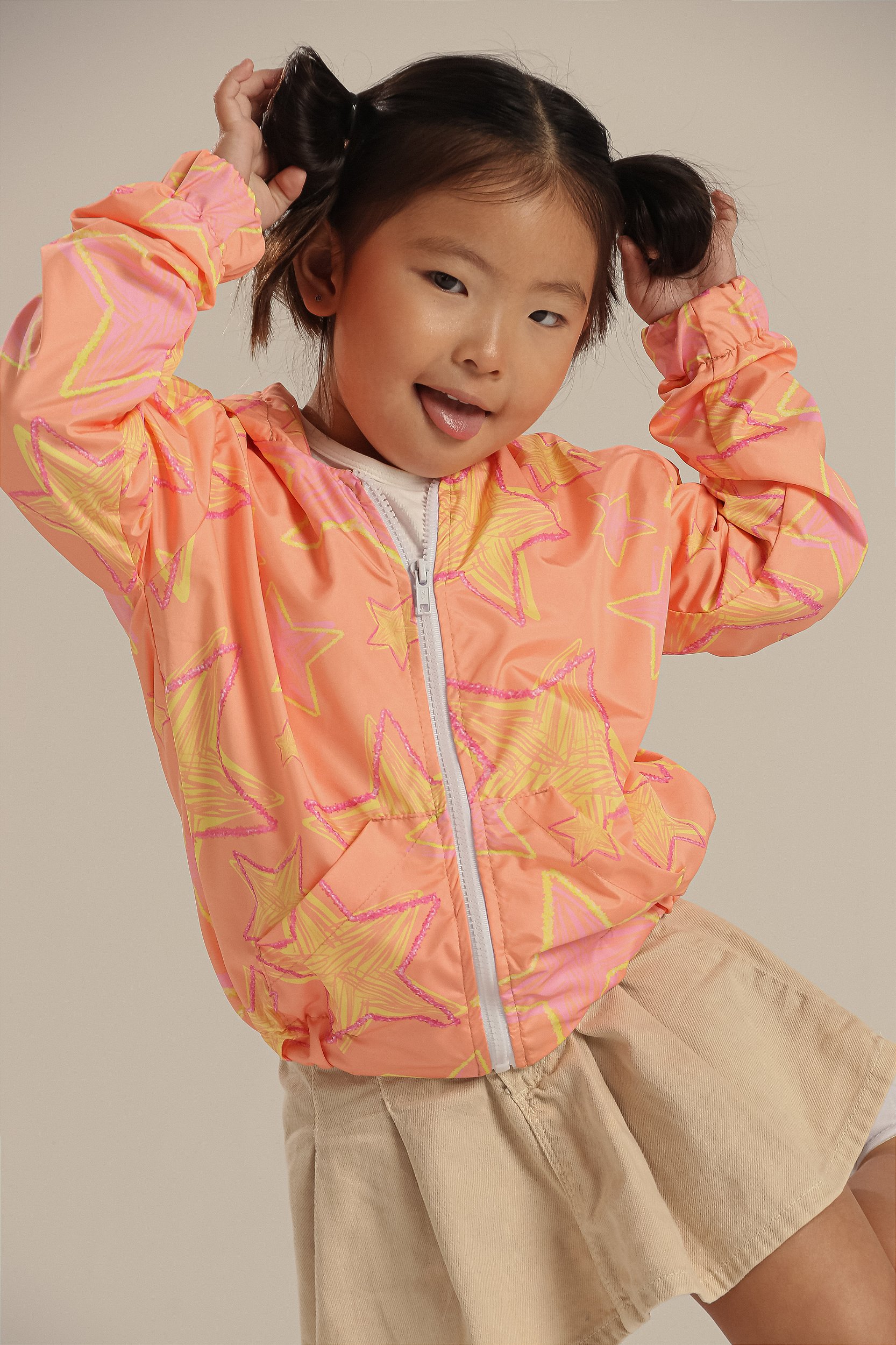 A Blusa Corta-Vento Estrela Salmão da Littlemoon é perfeita para acompanhar as pequenas em todas as aventuras. Com estampa delicada de estrelas em tons de salmão e tecido externo leve e resistente, ela protege do vento com muito estilo.